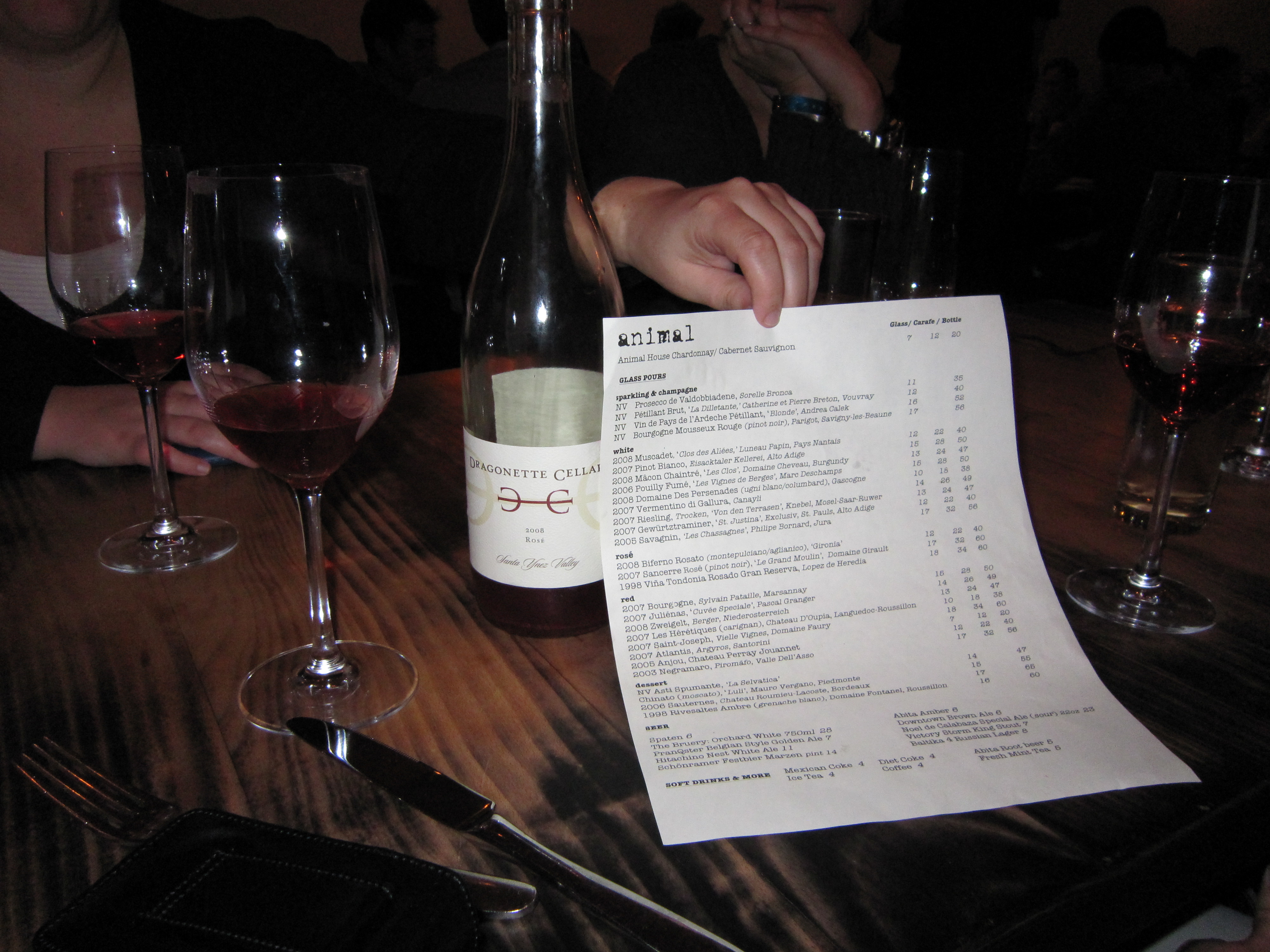 A foodie friend of ours Lee from Vancouver was going to be in Los Angeles and called to see if we wanted to meet up for dinner at Animal a couple nights ago. Jason and I haven’t seen Lee in a while and we love to try out new restaurants so we accepted the invitation. There were 7 of us who ended up at Animal at 8:45pm on a Tuesday night. As we waited for our table to open up, someone spotted Bobby Flay eating at a table near the bar. That is a good sign…I figure Flay knows a little something about food. Another good sign was a local who’d eaten there numerous times who was also waiting for a table absolutely gushing to us about the menu. He listed about 6 things off the menu that we “had to order”. I noticed that many of the tables were full in spite of the fact that it was late on a Tuesday – another good sign. The restaurant was sparsely decorated…actually to call it “sparse” implies too much. There were bare lightbulbs screwed into sockets on the walls and a couple of framed animal skulls hanging on the walls. Clearly the decor won’t be distracting us from the food. We were seated and started ordering almost immediately. I was pleasantly surprised to see the 2008 Dragonette Rose (Grenache / Syrah) on the bottle list. Dragonette is a premium quality, boutique winery located in Lompoc in an area affectionately called the “wine ghetto”. They’re making some beautiful wines – we barrel tasted there a few months ago and I fell in love with a barrel of co-fermented Syrah and Viognier. The rose was a perfect beginning to a fabulous meal! We ended up ordering nearly everything on the menu – it was all outstanding! Here is a photo of the menu for the evening that we were there.