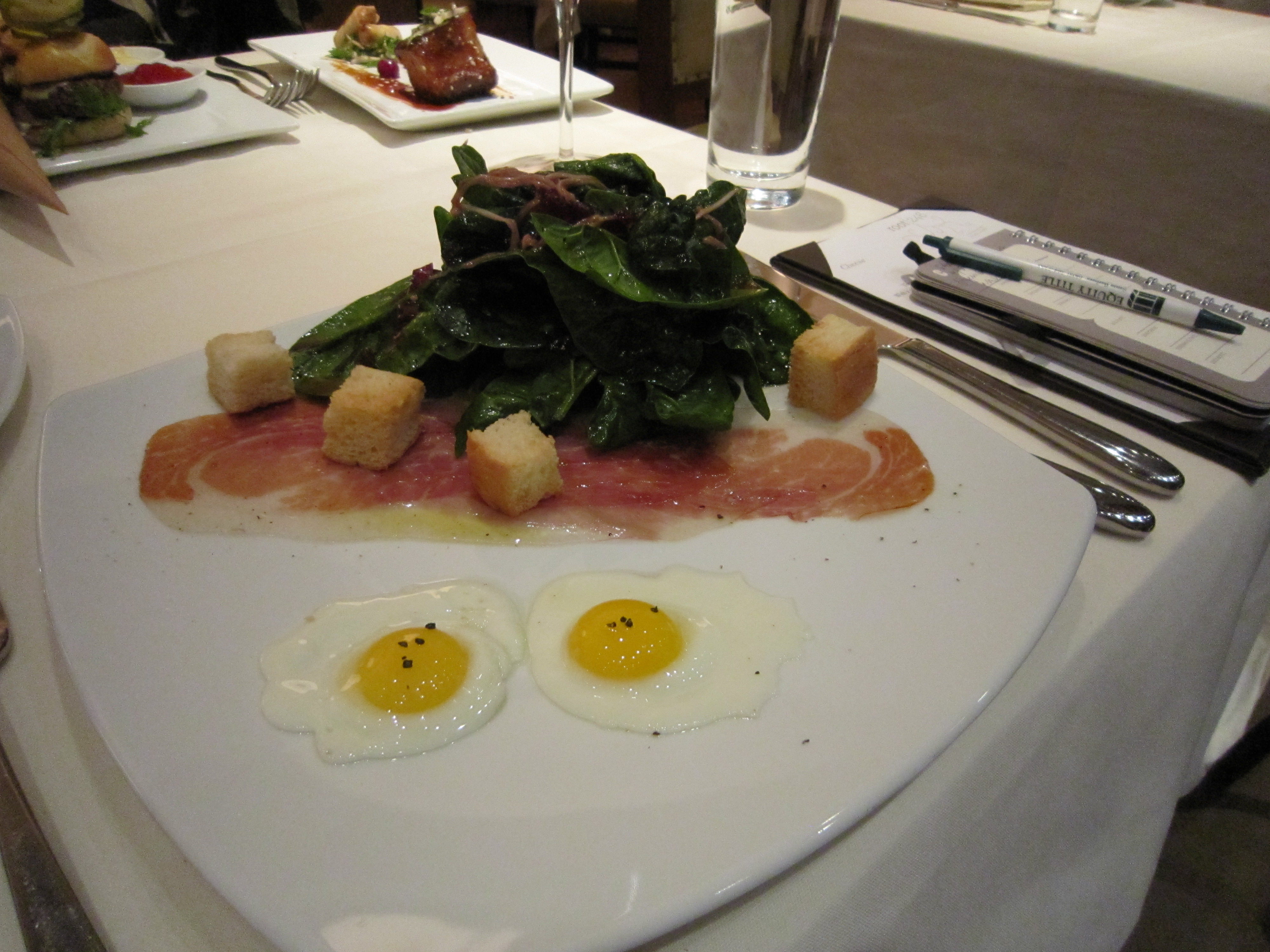 Next up was the warm “Bautista Farms” spinach salad, La Quercia proscuitto, quail egg and Minus 8 vinaigrette. The spinach was thicker and more crisp than any I’ve had before, rather more like swiss chard than spinach. Bautista Farms is located in nearby Arroyo Grande so the spinach is super-fresh.