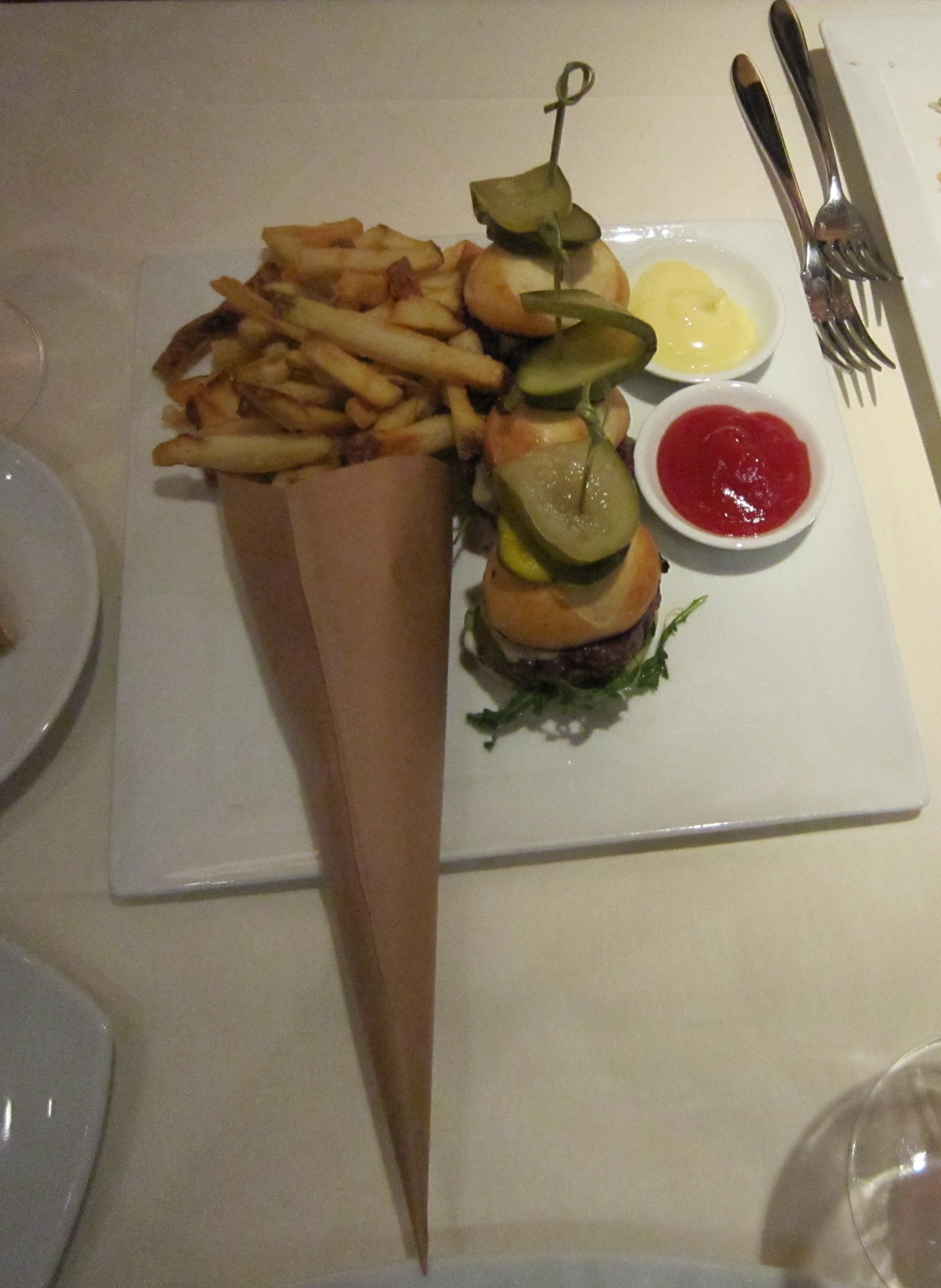 After the salad, we tucked into the beef sliders with atomic horseradish and fries with house made ketchup. These were off the bar menu which offers more casual fare than the dining room menu. The sliders were great except I really had my heart set on some spicy horseradish – after all, the menu said “atomic”. In reality, the kick from the horseradish was “sub-atomic”. With that said, it complemented the flavor of the beef and didn’t overpower the dish – which is probably what the chef planned. The fries, served in a paper cone (a fun little nod to street food fare) were warm and crisp and didn’t last on the plate very long. The sliders tasted especially good with Barrel 27‘s 2006 “Right Hand Man” Syrah. Barrel 27 is one of my favorites from Paso Robles. Winemakers McPrice Myers and Russel From are really making some fabulous wine up there.