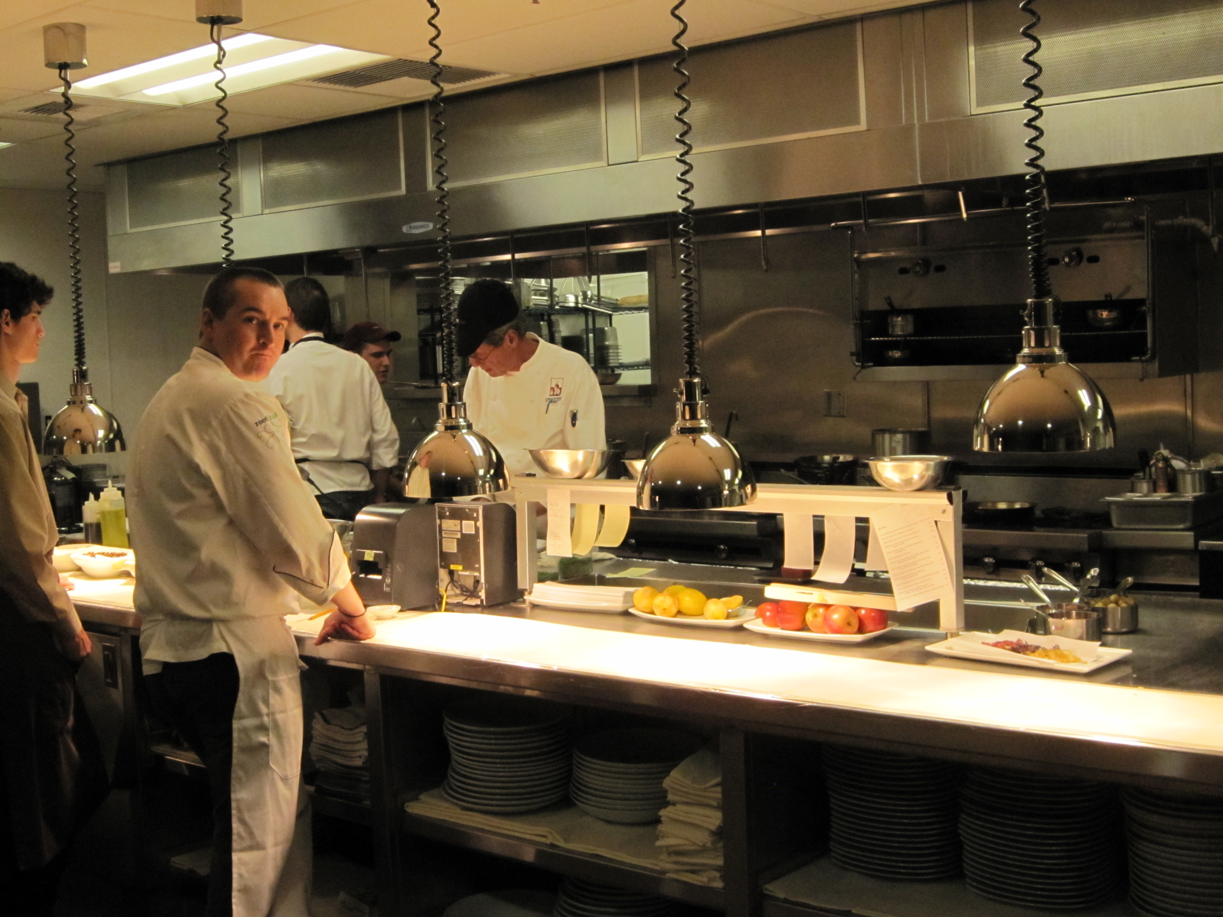 One of our wonderful waiters asked us if we wanted a tour of the kitchen. I cannot imagine why he asked me this question…maybe it was the fact that I kept photographing the plates of food? hmmmm… Of course we took him up on his offer! I learned that Root 246 doesn’t have a freezer – everything is fresh. The produce is used within two days from when it is delivered. Immediately upon delivery, all the fruit and herbs (organic and as local as possible) are washed and then stored on dated trays or in see-through bins. Root 246 uses local, organic foods whenever possible. You can taste the quality and the freshness – just take one bite of the spinach salad! But don’t take my word for it – go check it out yourself. And if you like to watch FoodTV, be sure to request the table *in* the kitchen! It is tough to get that table on Saturdays, so call a few weeks ahead to make your reservation.