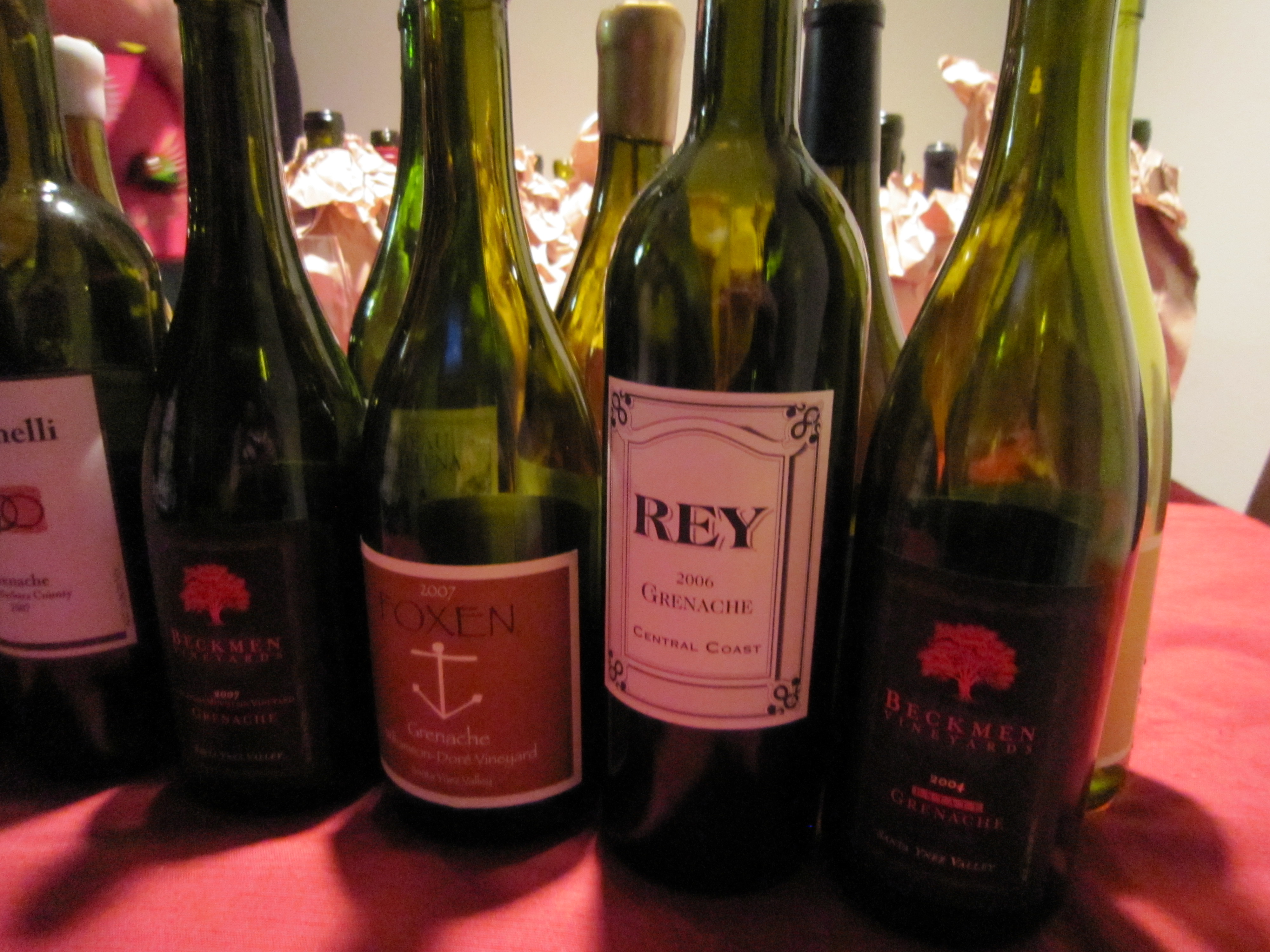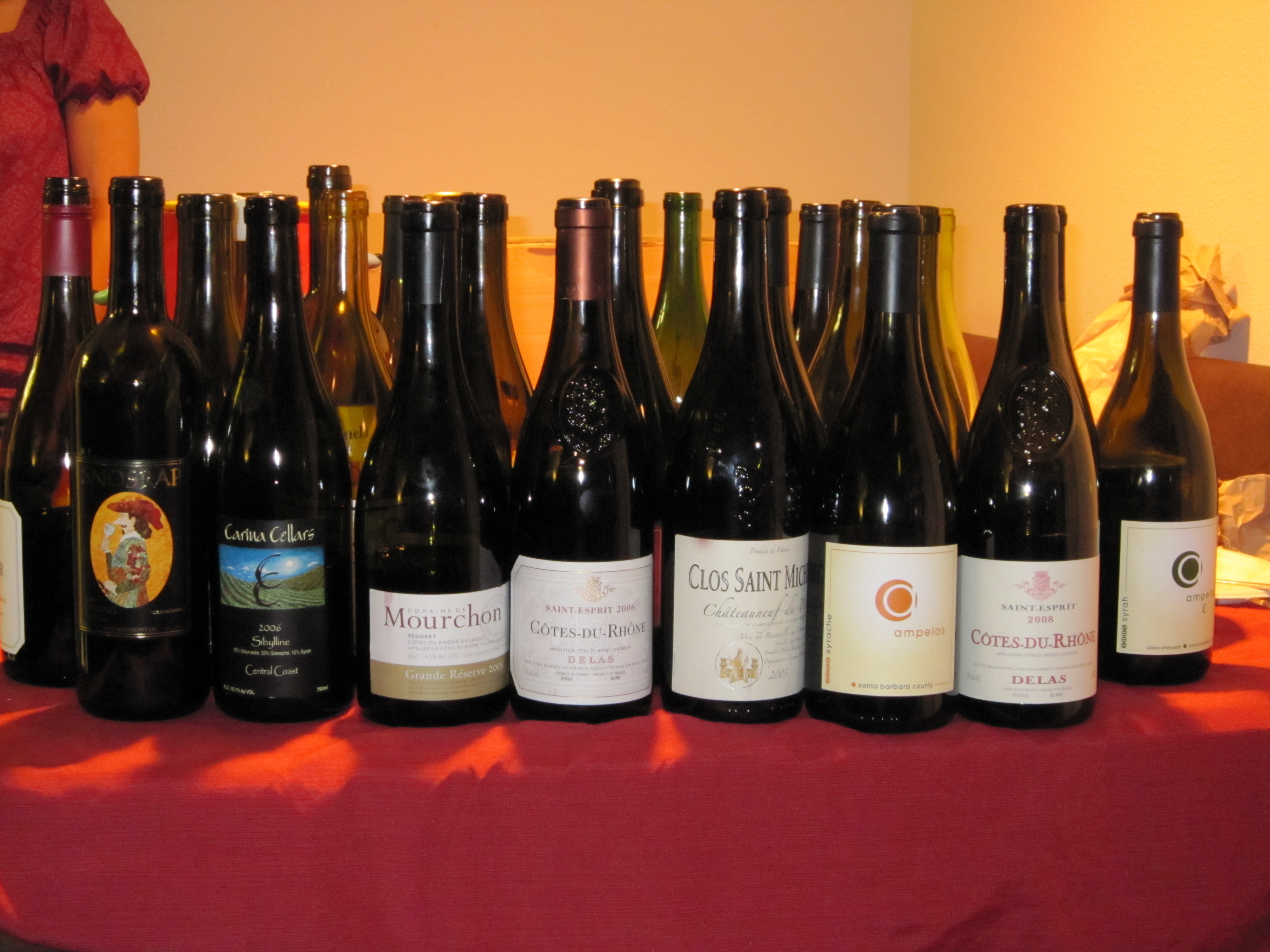 My friend Louise hosts a wonderful brown bag tasting every time she and friends feel like they need to cull their wine collections. She calls it a Winemergency. She specifies a type of wine or a few types as the unifying theme. Then attendees bring appetizers to share and a bottle or two. All the bottles are bagged, tasted and then everyone compares notes at the end just before the bottles are removed from the bags. This evening we tasted no fewer than twenty nine wines: seven Chardonnays, six Grenaches, nine Syrahs and seven blends. Needless to say we weren’t drinking the wine, we were tasting, spitting and then scribbling a few notes. I know some people feel like it is a waste to spit out wine – and I wholeheartedly agree with them. With that said, these events present an opportunity to taste many wines side by side, which is one of the best ways to train your palate. After every wine was swirled, tasted, compared and contrasted, there were a few bottles that really stood out from the crowd: 2006 Chateau Montelena Chardonnay, 2008 Brewer Clifton Chardonnay, 2007 Tre Anelli Grenache, 2004 Beckmen Estate Grenache and 2006 Rey Grenache (Note: priced around $20, the Rey is a great buy though it can be hard to find – try the Wine Hound in Santa Barbara or the Bounty Hunter in Napa if you’re trying to find Rey wines), 2005 Ampelos Epsilon Syrah, 2004 Beckmen Estate Syrah, 2006 Clos Saint Michel Châteauneuf-du-Pape (blend of 40% Grenache, 30% Syrah, 30% Mourvedre), 2006 Ampelos Syrache (blend of 73% Syrah, 27% Grenache), 2008 Delas Saint-Esprit Côtes du Rhône (blend of 70% Syrah, 20% Grenache, 5% Mourvedre, 5% Carignan and a with a price of $15 a great buy). In between tasting, spitting and scribbling notes, I managed to take a few snapshots.